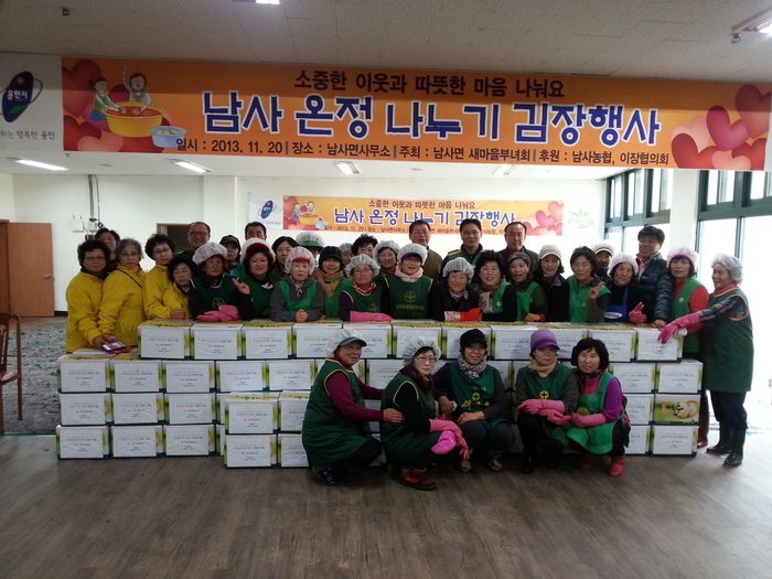 남사면은 지난 2001년부터 해마다 관내 독지가로부터 배추, 무, 대파, 갓 등 김장재료를 기부 받아 남사온정나누기 김장행사를 개최, 그동안 1,300여 명의 취약계층에게 혜택이 돌아갔다. 올해 김장재료(배추, 무)를 기부한 완장3리(중동) 심문섭 씨와 방아3리(아리실)오세동 씨는 “어려운 이웃과 정을 나눌 수 있는 일에 보탬이 되어 기쁘다”고 밝혔다. 김정순 남사면 새마을부녀회장은 “남사면새마을부녀회 중심으로 일치단결하여 소중한 이웃에게 따뜻한 마음을 전하게 되어 보람이 크다”며 “ 앞으로도 한마음 한뜻으로 남사 발전은 물론 함께하는 행복한 용인 만들기에도 앞장설 것”이라고 말했다.