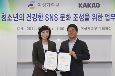 여성가족부(장관 조윤선)는 (주)카카오(공동대표 이제범, 이석우)와5월 19일(월) 11시 여성가족부 대회의실(서울청사)에서 '청소년들의 건강한 소셜네트워크서비스(SNS : Social Network Service) 문화 조성을 위한 업무협약'을 체결했다.