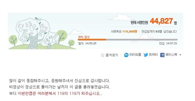 이같은 청원글과 서명운동이 확산되고 있는 이유는 신설될 국가안전처에 소방방재 기능이 흡수되면서 소방방재청이 흡수된다는 소식이 전해졌기 때문이다.