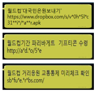 추가로 확인된 스미싱 문자는 '월드컵 대국민은원보내기', '월드컵기간 파리바게트 기프티콘 수령', '월드컵 거리응원 교통통제 미리체크 확인' 등이며 인터넷주소(URL)를 포함하고 있다.