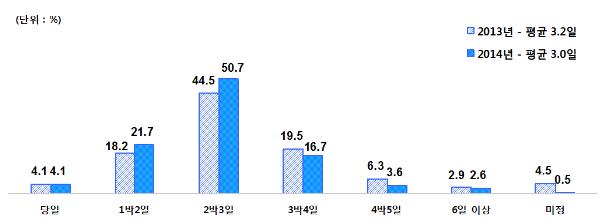 여행 평균 기간은 3.0일로, 2박 3일(50.7%)이 가장 많았으며, 그 다음으로는 1박 2일(21.7%), 3박 4일(16.7%)의 순서로 나타났다.