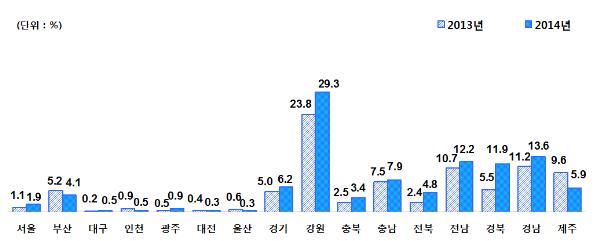 휴가여행 목적지는 강원도-경상남도-전라남도-경상북도-충청남도 등의 순서로, 2013년과 비교하였을 때 제주도가 소폭 감소한 반면, 경상북도는 증가한 것으로 나타났다. 제주도의 경우, 저비용항공(LCC)이 보편화되면서 성수기와 비수기의 구분이 사라진 4계절 관광지로 자리매김함으로써 여름휴가여행 목적지로서의 비율은 다소 감소한 것으로 분석된다.