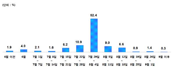 응답자들의 국내 휴가여행 출발 계획 시점은 7월 29일 ~ 8월 4일(52.4%)이 가장 높게 나타났으며, 이어 7월 22일 ~ 7월 28일(10.9%), 8월 5일 ~ 8월 11일(9.0%), 8월 12일 ~ 8월 18일(6.6%), 7월 15일 ~ 7월 21일(6.2%) 순서로 조사돼, 7월 말에서 8월 초까지 여름휴가 여행이 집중될 것으로 예상된다.