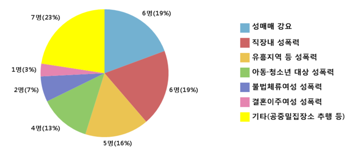 범죄 유형별로는 성매매 강요 6명(19%), 직장 내 성폭력 6명(19%), 유흥지역 등에서 성폭력 5명(16%), 아동·청소년 대상 성폭력 4명(13%) 순이었다.