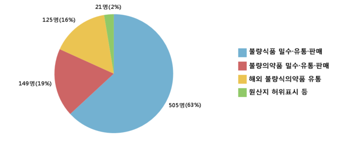 불량 식품·의약품 사범은 800명(7명 구속)으로 가장 많은 인원을 검거했으며, 국내 불량 식·의약품 밀수·유통·판매 사범이 대부분(654명,82%)을 차지했다.