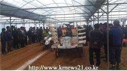 군은 지난 5일 국립식량과학원 바이오에너지작물센터 시범포장에서 농가 40여명이 참여한 가운데 밭작물 기계화를 위한 ‘야채이식기’ 시연회를 가졌다.