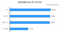 채용한 중장년의 평균 근속기간은 ‘1년 이상’ 근속자가 58.2%(‘1~2년’ 29.3%, ‘2년 이상’ 28.9%)로 대체로 입사 후 잘 적응하고 있는 것으로 나타났다. ‘6개월~1년’은 28.6%, ‘6개월 미만’은 13.2%로 가장 낮았다.