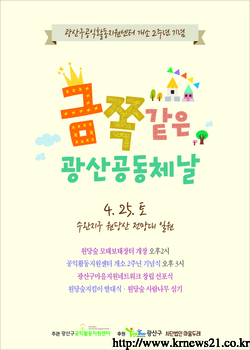 광산구와 주민들 사이에서 풀뿌리 마을공동체와 사회적경제 설립·활성화 지원 등 활발한 활동을 이어가고 있는 광산구공익활동지원센터(센터장 윤난실)가 25일 개소 2주년을 맞아 ‘금쪽같은 광산공동체 날’ 행사를 연다.