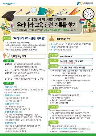 행정자치부 국가기록원은 11일부터 6월 14일까지 “우리나라 교육 관련 기록물 찾기”라는 주제로 ‘15년 민간기록물 기증 행사를 진행한다.
