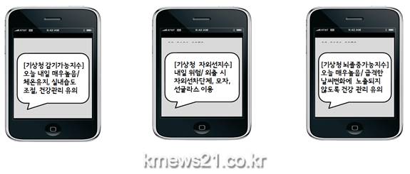 ▲ 문자서비스 예시기상청은 국민의 생활편의와 건강보호를 위해 제공하고 있는 ‘취약계층 대상 생활기상정보 문자서비스’를 6월 1일부터 전국 취약계층(△노인 △영유아 △장애인)관리자 10,000여 명을 대상으로 확대하여 운영한다.