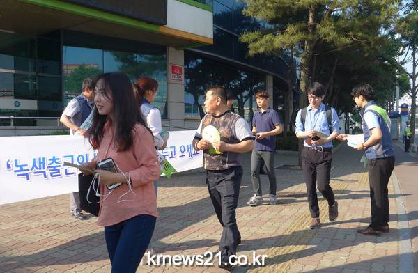 매년 기후변화주간에 일회성 행사로 실시하던 녹색출근길을 한 달에 한 번으로 늘리고, 29일 구청과 보건소 일대에서 그 첫 실천행사와 함께 대중교통 이용 캠페인을 진행한 것. 이날 광산구 공직자들은 장애인, 임산부 등 특별한 경우를 제외하고 대중교통이나 자전거, 도보로 출근해 행사에 동참했다.