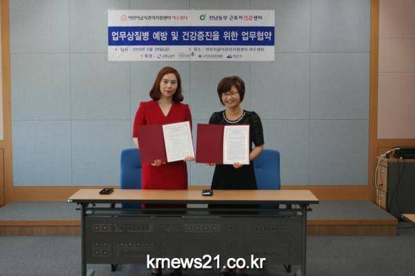 전남동부근로자건강센터(센터장 정미라)와 여수시어린이급식관리지원센터(센터장 고상희)는 지난 5월 29일 ‘어린이급식종사자의 업무상 질병 예방 및 건강증진’을 위한 업무협약을 체결했다.