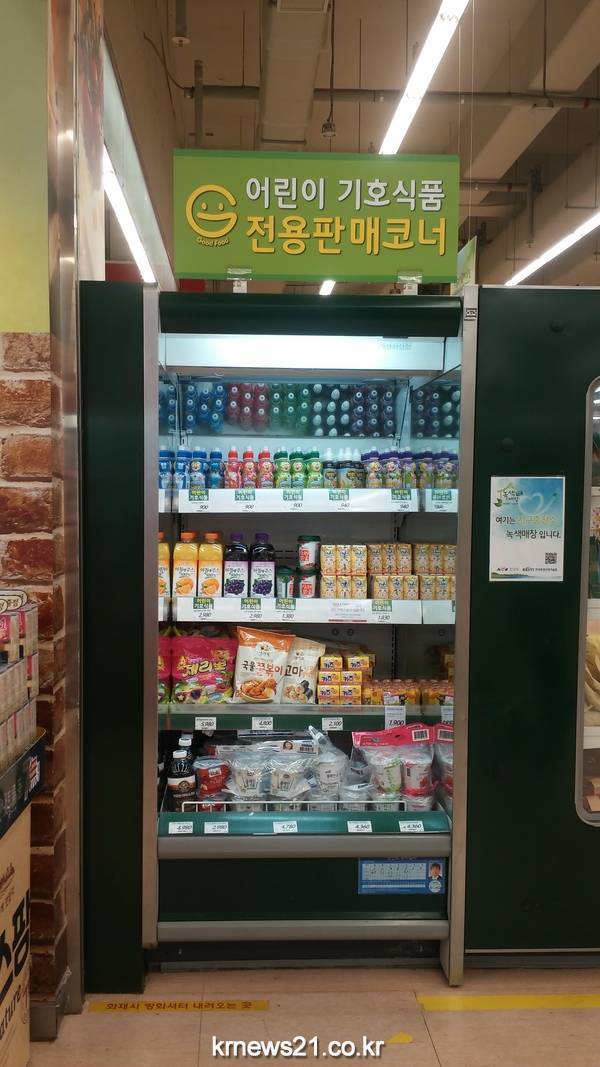 어린이식품 판매코너는 안전한 먹거리를 위해, 아이들이 즐겨 찾는 기호식품 중 식품의약품안전처의 기준에 적합한 제품을 진열하고 파는 곳. 식약처는 어린이들이 즐겨 찾는 과자·캔디·빙과·초콜릿·빵 등 제품의 1회 섭취량인 30g 당 열량 250kcal 포화지방 4g, 당류 17g 이하, 비타민과 무기질은 15% 이상일 것을 주문하고 있다.