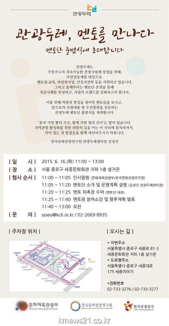 문화체육관광부(이하 문체부)는 한국문화관광연구원(이하 연구원)과 함께‘관광두레 멘토단’을 구성해 6월 16일(화) 세종문화회관 내에서 위촉식을 갖고 본격적인 활동을 시작한다. 출범식에서는 위촉장 수여와 함께, 멘토링 추진계획을 논의하는 시간을 마련한다.