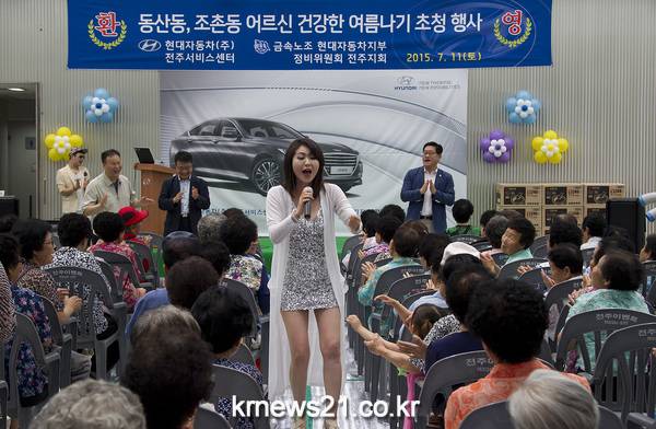 현대자동차 전주서비스센터(센터장 구재왕)가 11일 사업장 인근에 거주하는 지역 어르신들의 건강한 여름 나기를 돕기 위해 발벗고 나섰다. 노사가 함께 뜻과 힘을 모아 사업장 소재지인 전주시 팔복동 인근 동산동과 조촌동 거주 어르신 80명을 초청해 건강한 여름 나기를 주제로 볼거리와 먹거리를 곁들인 풍성한 잔치 한마당을 개최한 것.