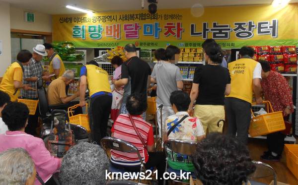 희망배달마차 나눔장터는 광주시사회복지협의회 주관, ㈜신세계·광주신세계·이마트 공동 후원으로 생활이 어려운 이웃을 직접 찾아가 이동식 마트를 열고 500만원 상당의 생필품 등을 지원하는 장터.