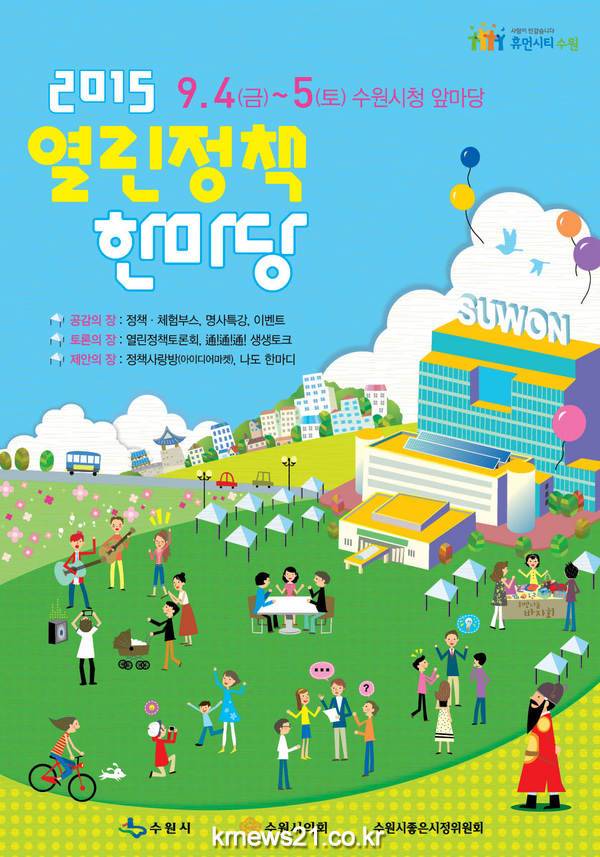 수원시가 다음달 4일과 5일 양일간 시청 일원에서 ‘시민이 꿈꾸는 희망도시’라는 주제로 보고, 느끼고, 제안하는 ‘2015 열린 정책 한마당’을 개최한다.