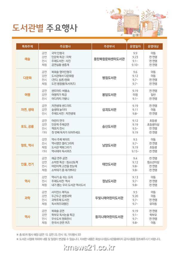 동탄 복합문화센터 도서관에서는 동탄 후마니타스 김원숙 대표의 미학 강연, 태안도서관에서는 현직교사에게 듣는 ‘책 읽기의 즐거움’강연, 병점 도서관에서는 ‘지원이와 병관이’로 잘 알려진 고대영 동화작가와의 만남, 태안도서관에서는 ‘해금 그리고 가을’연주회, 삼괴도서관에서는 샌드 아트와 버블 쇼, 두빛나래 어린이도서관에서는 ‘과학아 놀자’ 사이언스 매직 쇼가 준비됐다.