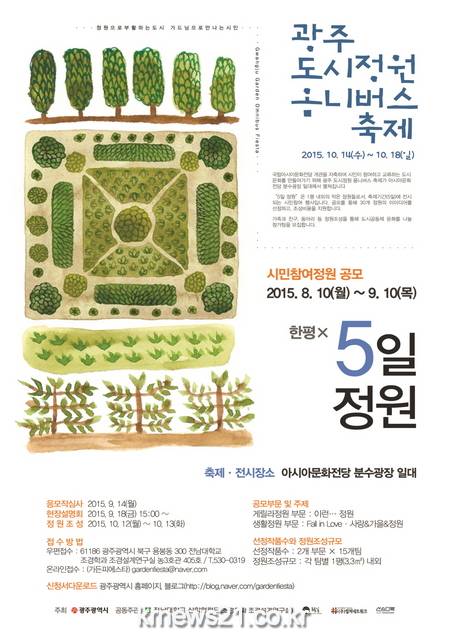 광주광역시는 2015년도 게릴라가든이벤트사업으로 오는 10월 국립아시아문화전당 분수대 광장 일대에서 ‘2015 광주 도시정원 옴니버스 축제’를 개최한다.