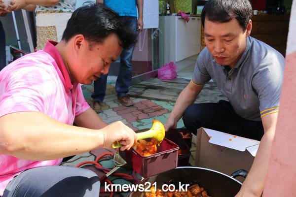 이날 대동회에서 마을자원봉사단 단원들은 마을두레 가게인 Y마트 송정점(대표 강중식)과 블루핸즈 송정점(대표 오성중)이 내놓은 식재료로 닭볶음과 열무김치를 만들어 홀로 사는 어르신 6세대에 전달했다.