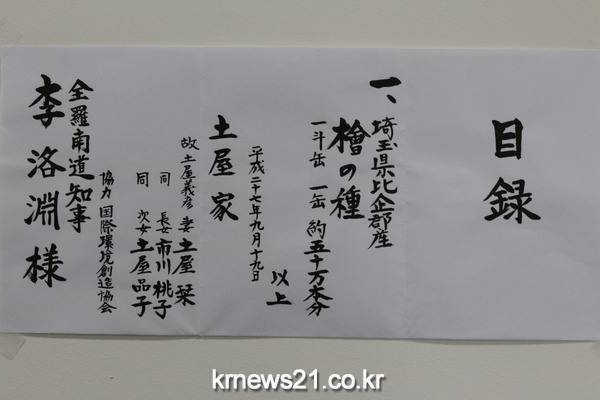 시나코 위원장은 또 “한국과 일본은 ‘가깝고도 가까운 이웃’으로서 양국민끼리 어떠한 때에도 서로를 신뢰하고 우호하기를 바란다”며 올해 한일 국교정상화 50주년을 맞아 한일우호를 기원하는 마음을 담아 아버지에 이어 편백 씨앗을 보낸다고 말했다.