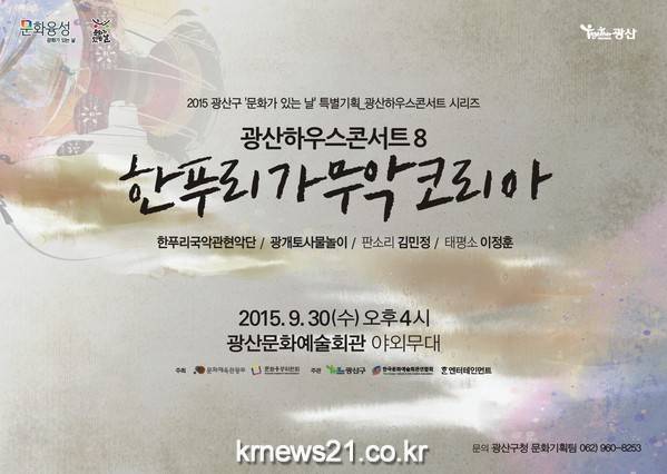 매월 마지막 수요일 ‘문화가 있는 날’ 9월 행사로, 먼저 오후 4시 광산문화예술회관 야외무대에서는 <광산하우스콘서트8-한푸리가무악코리아>가 열린다. 국가주요무형문화재 제45호 이수자인 이관웅 씨 지휘로 한푸리국악관현악단, 광개토사물놀이 연주단과 국악인 김민정, 태평소 연주자 이정훈 씨까지 총 30여명의 연주자들이 4가지 색깔의 무대를 펼친다.