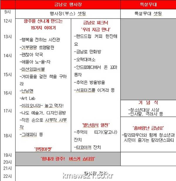 금남로 1가에서 3가까지 차없는 거리에서는 청소년과 시민이 주인이 되는 광장을 운영하며 신나는 축제 한마당으로 낮 1시부터 오후 9시까지 ▲행복을 찍는 사진관, 기부팡팡 트램펄린, 거미줄에 걸린 책을 구하라, 별난음식열전, 나도예술가 디자인공방 등 ‘광주를 신나게 만드는 19가지 이야기’ ▲청소년과 시민들이 무대 중심이 아닌 금남로 거리에서 자유롭게 펼치는 ‘힘내라 광주! 버스커쇼타임’ 등 금남로 거리프로젝트 ▲청소년의 땀으로 만든 맛있는 음식과 수공예품을 판매하는 ‘한땀마켓’ ▲인조잔디와 인디언텐트에서 자유롭게 피크닉을 즐기는 ‘금남로 피크닉, 우리 지금 만나’ 등 다채로운 거리프로그램을 펼친다.