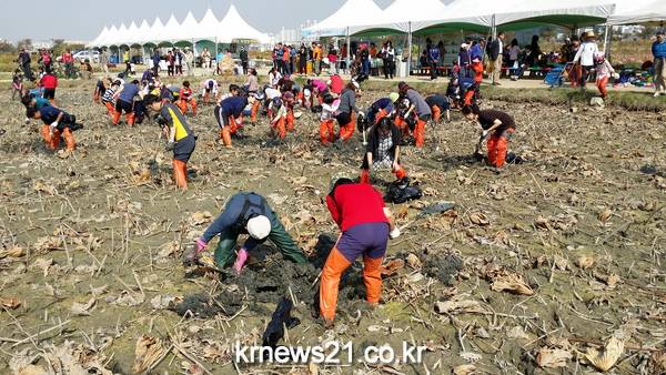 시흥시가 연꽃테마파크에서 오는 17일 가족, 일반인 등 300여명이 참여하는 연근 캐기 체험행사를 개최한다.