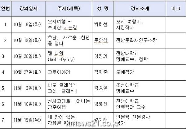 한편, 시민 숲 문화강연은 오는 11월19일까지 매주 화요일 총 7회 운영하며, 직장인과 학생 등이 참여할 수 있도록 오후 7시에 시청에서 무료로 진행된다. 다만 마지막 7강은 목요일에 개최한다.