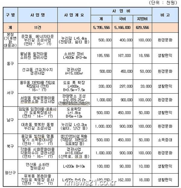 사업 내용을 보면, 기반시설 및 생활편익사업은 ▲동구 월남동 칠전마을 소하천 정비사업 ▲서구 용두동 자연마을 진입로 확장공사 ▲남구 임암동 임정마을에서 포충사 간 도로확장공사 ▲북구 용강동 빛찬들 명품딸기 소득증대사업 ▲광산구 연산동 소하천 정비공사, 유계동 본촌마을 진입로 확포장 공사 등 6개다.