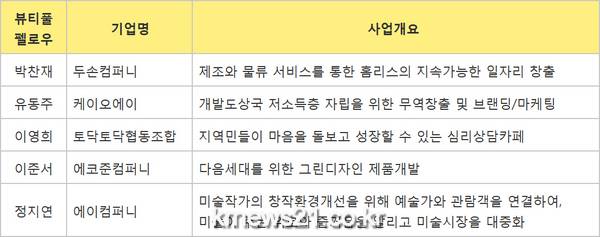 이번에 선발된 뷰티풀펠로우 5기는 △박찬재(두손컴퍼니) △유동주(케이오에이) △이영희(토닥토닥협동조합) △이준서(에코준컴퍼니) △정지연(에이컴퍼니) 등 총 5명이다.