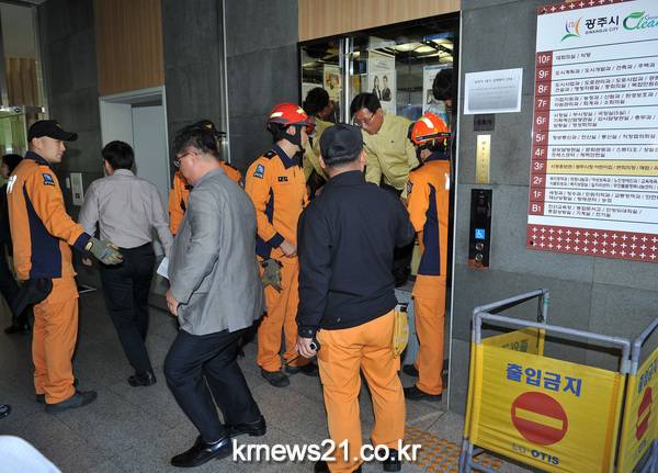 광주시는 29일 청사 1층 로비에서 시관계자, 광주소방서, 승강기안전관리원 등 15여명이 참여한 가운데 ‘승강기 갇힘 사고 승객구조 훈련’을 실시했다.