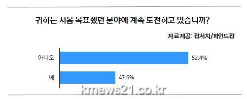 취업검색엔진 잡서치(대표 최인녕 www.job.co.kr)가 취업전문포털 파인드잡(www.findjob.co.kr)과 공동으로 20대에서 30대까지 취업준비생 1,155명을 대상으로 실시한 설문조사에 따르면, 응답자의 절반이 넘는 52.4%가 처음 취업을 목표했던 분야를 유지하지 못하고 방향을 바꾼 것으로 드러났다.