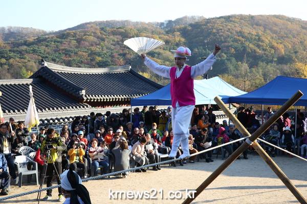 지난 10월의 끝자락 31일 토요일 오후 3시에 가을의 정취가 물씬 풍기는 남한산성 외행전에서 여자‘어름산이 조송자 줄타기 재담 및 기예 복원’의 행사가 성황리에 마무리 되었다.