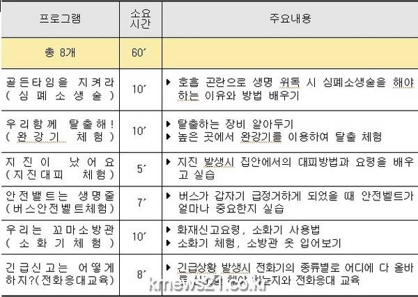 안전체험관 운영은 일회성 체험에 그치지 않고 어린이에게 안전 습관이 조기 정착될 수 있도록 방향을 제시하고 스스로 안전의 중요성을 체감할 수 있게 ▲심폐소생술 ▲완강기 체험 ▲지진대피 체험 ▲버스안전벨트 체험 ▲소화기체험 등 안전교육을 할 계획이다.
