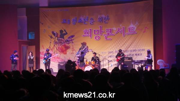 안산시가 주최하고 안산시청소년수련관이 주관한 ‘고3 청소년을 위한 희망콘서트’가 지난 11월 27일에 안산시청소년수련관 체육관에서 수능시험을 마친 700여명의 관내 고3 수험생이 참석한 가운데 성황리에 개최됐다.