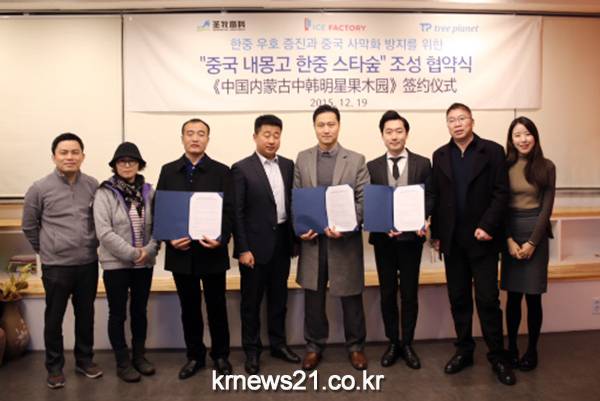 중국 유기농 유제품 기업 성목초업(대표 리유원광), 수제 스틱 아이스크림 전문 기업 아이스팩토리(대표 채정한), 나무 심는 사회혁신기업 트리플래닛(대표 김형수)이 20일 중국 내몽고 사막화 지역에 숲을 조성하는 ‘내몽고 우란푸화사막 과수목원 공동조성 캠페인 합작 협약(MOU)’을 체결했다.