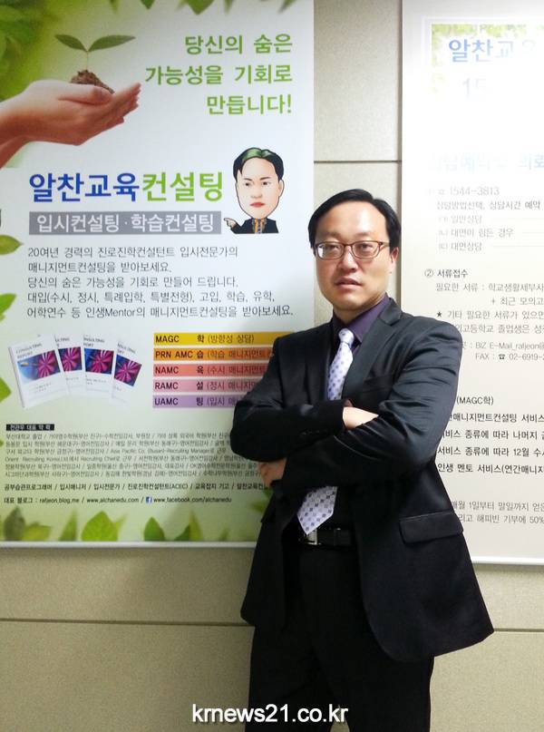 알찬교육컨설팅은“예술작품을 창조하듯 한 명 한 명 혼신의 힘을 다해 당신의 간절한 꿈을 실현한다”라는 비전 아래 25년 대입상담 경험의 입시컨설턴트인 전관우 대표가 2011학년도 대입부터 1단계 대면상담을 비롯 학습컨설팅, 입시관리컨설팅인 매니지먼트입시컨설팅을 학생과 학부모에게 제공하고 있다. 전관우 대표는 교육잡지와 교육신문에 기고활동을 비롯 방송에도 출연하고 있다.