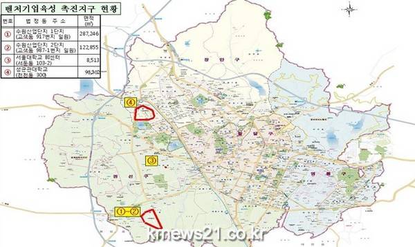수원시는 지난 2012년 중소기업청으로부터 수원산업단지와 성균관대BI센터 및 서울농생대 BI센터를 ‘수원 벤처기업육성촉진지구’로 지정받아 지원 사업을 추진했다. 그 결과 2011년도에 75개사였던 수원 벤처기업육성촉진지구의 입주기업이 2012년도 98개사, 2013년도 124개사, 2014년도 131개사, 2015년말 147개사로 지속적으로 증가했다. 촉진지구 내 벤처기업은 수원시 벤처기업 총 630개사 중 23.4%에 차지하고 있다.