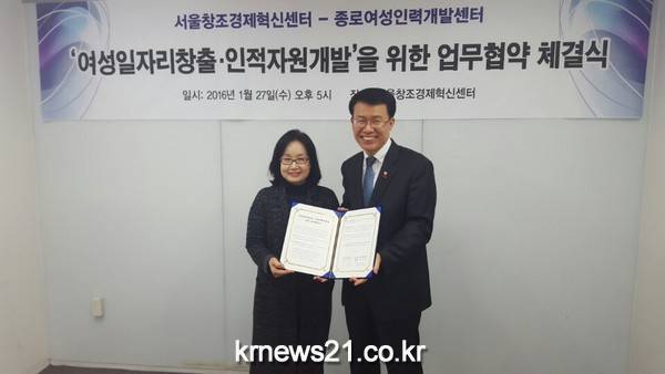 종로여성인력개발센터(여성새로일하기센터)(관장 김영남)와 서울창조경제혁신센터(센터장 박용호)가 27일(수), 서울창조경제혁신센터에서 여성일자리창출과 인적자원개발을 위한 업무 협약을 했다.