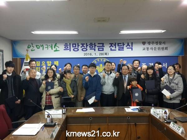 광주경찰서(경찰서장 강도희)는, 28일 오후 5시, 경찰서 소회의실(2층)에서 경찰서장 및 교통경찰과 협력단체인 교통자문위원회가 참석한 가운데 선정된 어려운 이웃을 초대하여 “안매켜소 조기정착을 위한 희망 장학금 전달식”을 개최하였다.