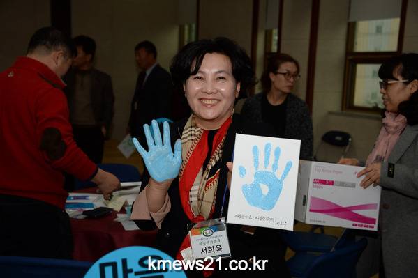 26일 첫 번째 회의를 가진 투게더광산우산동 지역사회보장협의체 위원 40여 명이 보다 따뜻한 우산동을 만들겠다는 각자의 결의를 백지에 적고 손도장을 찍은 ‘작품’이다.