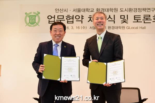 제종길 안산시장과 최막중 서울대학교 환경대학원장은 3월 16일 서울대학교 환경대학원에서 안산의 지속적인 도시발전을 위한 장기비전을 수립하고 도시 경쟁력을 확보하고자 도시환경정책 연구 업무협약을 체결했다.