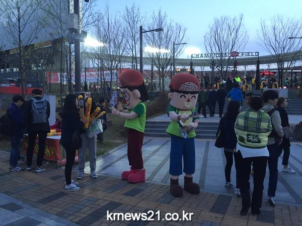 ‘eco-5 family’는 지난 5일 오후 기아챔피언스필드에서 열린 2016 타이어뱅크 KBO 리그 프로야구 KIA 타이거즈와 LG 트윈스의 광주 개막전을 찾아 세계친환경디자인박람회 성공개최를 위해 응원전 못지않은 열띤 홍보전을 펼쳤다.