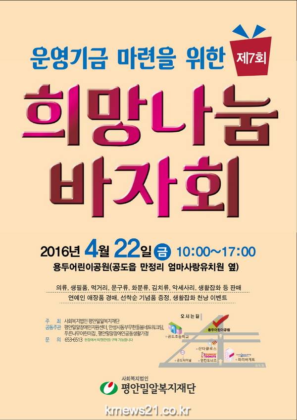 사회복지법인 평안밀알복지재단(대표이사 한덕진)은 오는 22일(금) 공도 용두어린이공원에서 오전 10시부터 오후 5시까지 제 7회 희망 나눔 바자회를 개최한다.