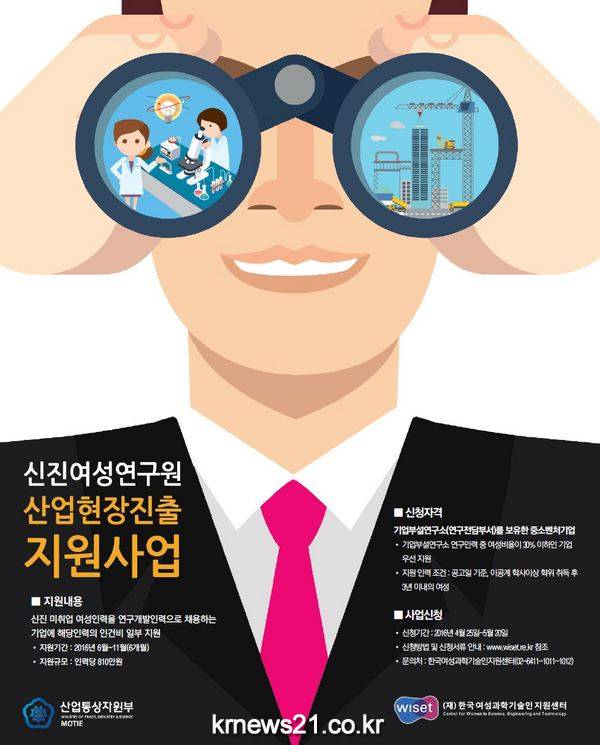 이 사업은 여성을 기업부설연구소나 연구전담부서에 연구원으로 채용했거나 채용 예정인 중소기업에 인건비를 지원하는 사업이다. 선정된 기업에게는 6월부터 11월까지 6개월간 여성인력 1명당 810만 원을 지원한다. 더불어 여성연구원의 연구역량을 높이는 교육, 멘토링 및 컨설팅도 같이 제공한다.