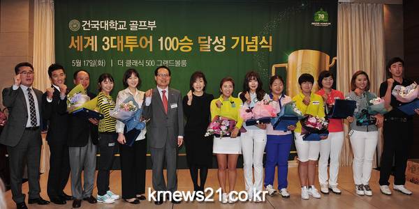 건국대학교(총장 송희영)는 17일 오후 서울 광진구 더 클래식 500 그랜드볼룸에서 건국대 골프부의 ‘세계3대 투어 100승 달성’ 기념행사를 개최하고 소속 선수들에게 공로패를 수여했다.