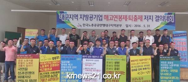대구도시철도노동조합(위원장 윤종박)이 5월 31일(화) 13시 문양차량기지 후생동 강당에서 한국노총 공공연맹 대구지역본부 주최로 ‘대구지역 지방공기업 해고연봉제 및 퇴출제 저지를 위한 결의대회’를 개최하였다.