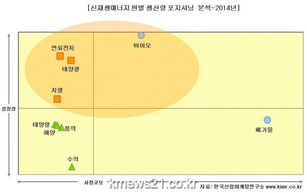 2014년 신재생에너지 원별 생산량 포지셔닝을 살펴보면, 폐기물이 여타 에너지원에 비해 압도적으로 큰 시장을 형성하고 있다. 바이오는 상대적으로 높은 성장성을 바탕으로 신재생에너지 시장 확대를 주도하고 있으며, 연료전지와 태양광, 지열도 상대적으로 높은 성장성을 나타낸다.