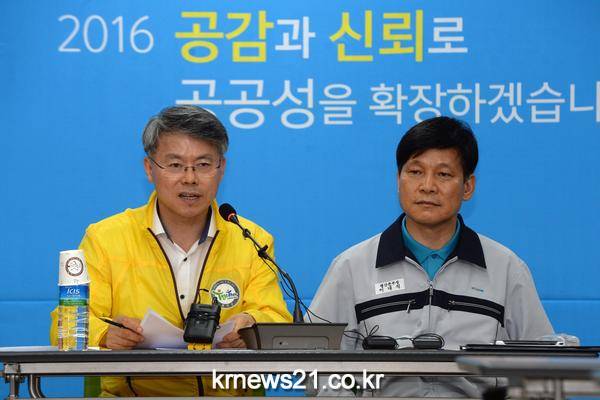 민 구청장은 발암물질 배출 사실이 알려진 13일 오후 4시 광산구청 상황실에서 긴급 기자회견을 가졌다.
